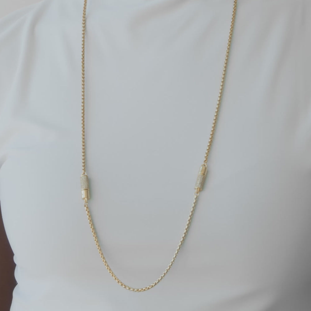 A longer softbox chain earns a touch of shine via pavé-embellished closures in this versatile, two-in-one piece. More than just a playful sense of adornment, these junctures can be easily separated out into both a shorter chain and a bracelet for a touch gleam from neck to wrist.
